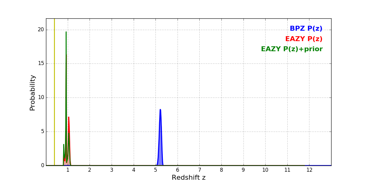 In P(z) plots: Yellow lines mark the cluster redshift z = 0.383,