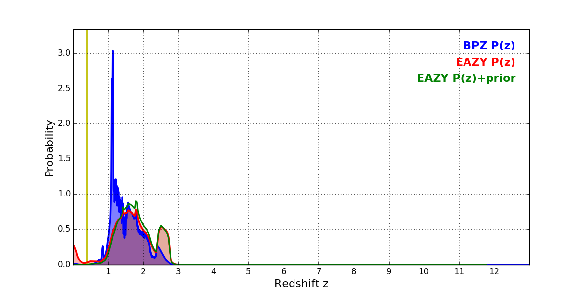 In P(z) plots: Yellow lines mark the cluster redshift z = 0.383,