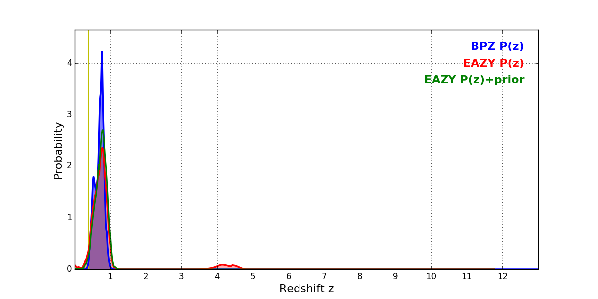 In P(z) plots: Yellow lines mark the cluster redshift z = 0.383,