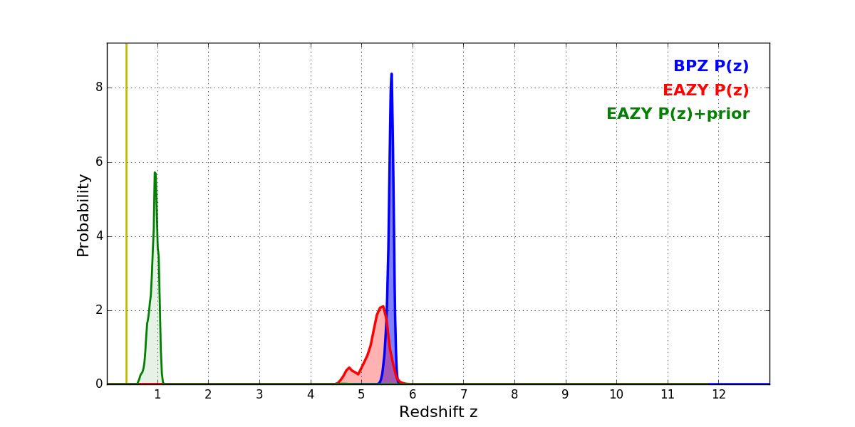 In P(z) plots: Yellow lines mark the cluster redshift z = 0.383,