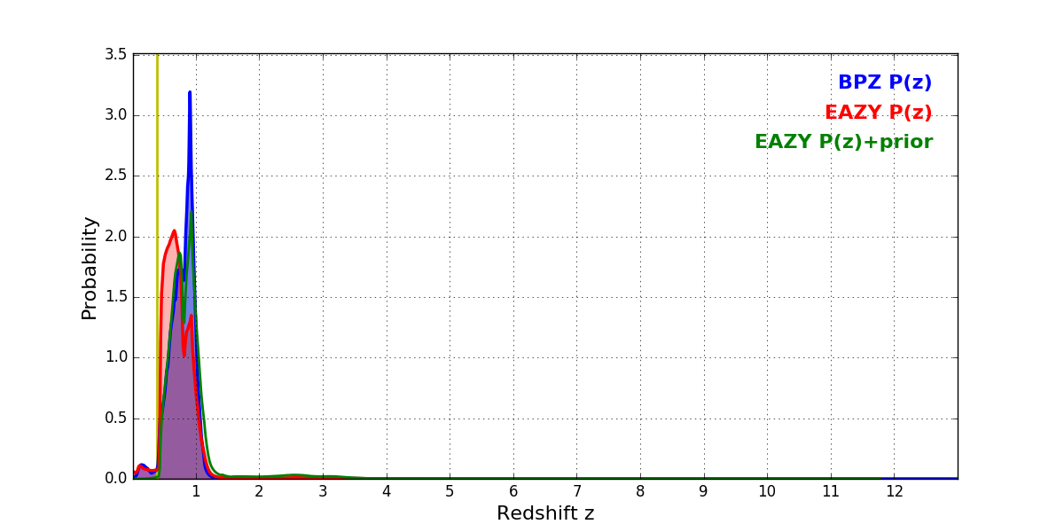 In P(z) plots: Yellow lines mark the cluster redshift z = 0.383,