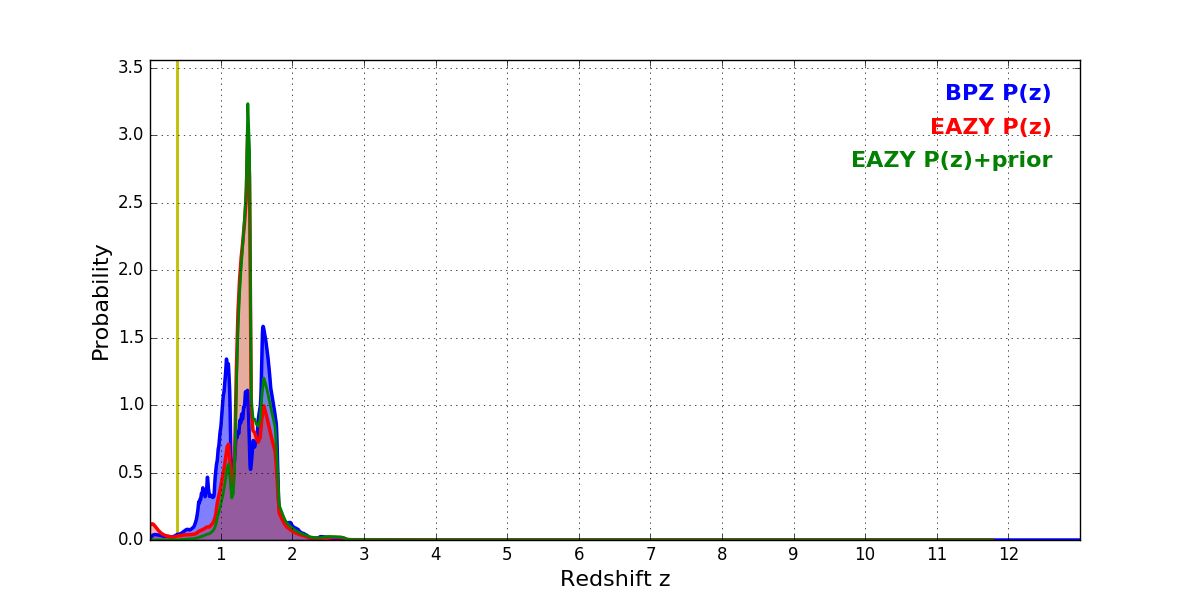 In P(z) plots: Yellow lines mark the cluster redshift z = 0.383,