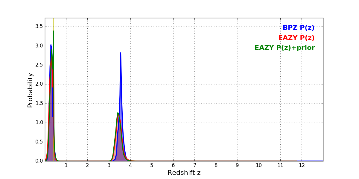 In P(z) plots: Yellow lines mark the cluster redshift z = 0.383,