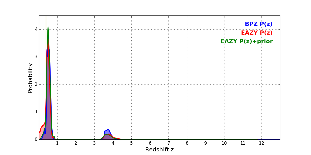 In P(z) plots: Yellow lines mark the cluster redshift z = 0.383,