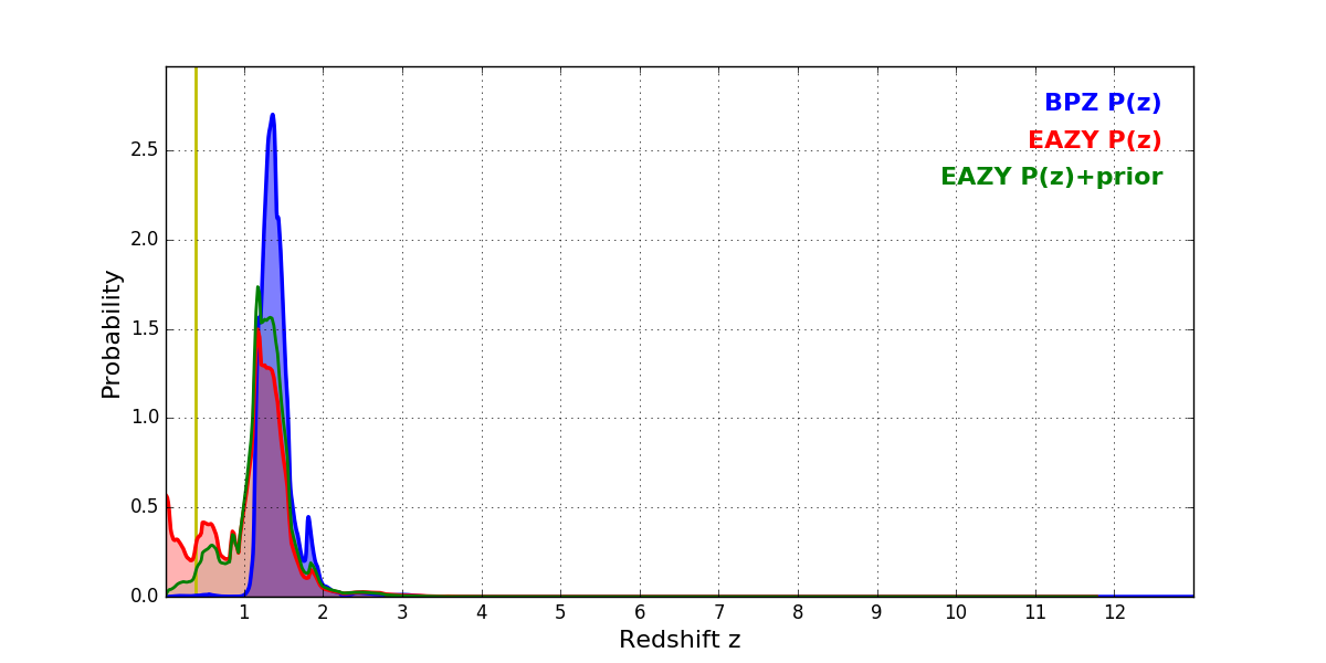 In P(z) plots: Yellow lines mark the cluster redshift z = 0.383,