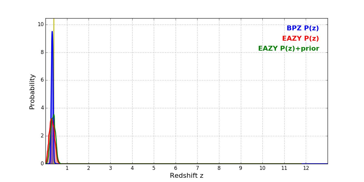 In P(z) plots: Yellow lines mark the cluster redshift z = 0.383,