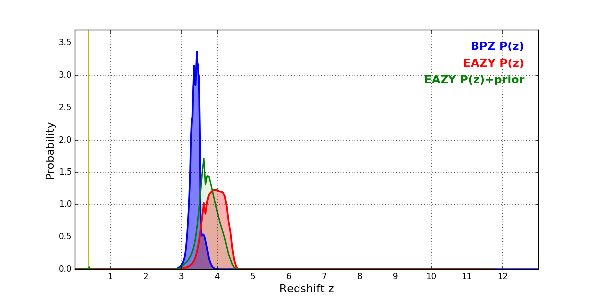 In P(z) plots: Yellow lines mark the cluster redshift z = 0.383,