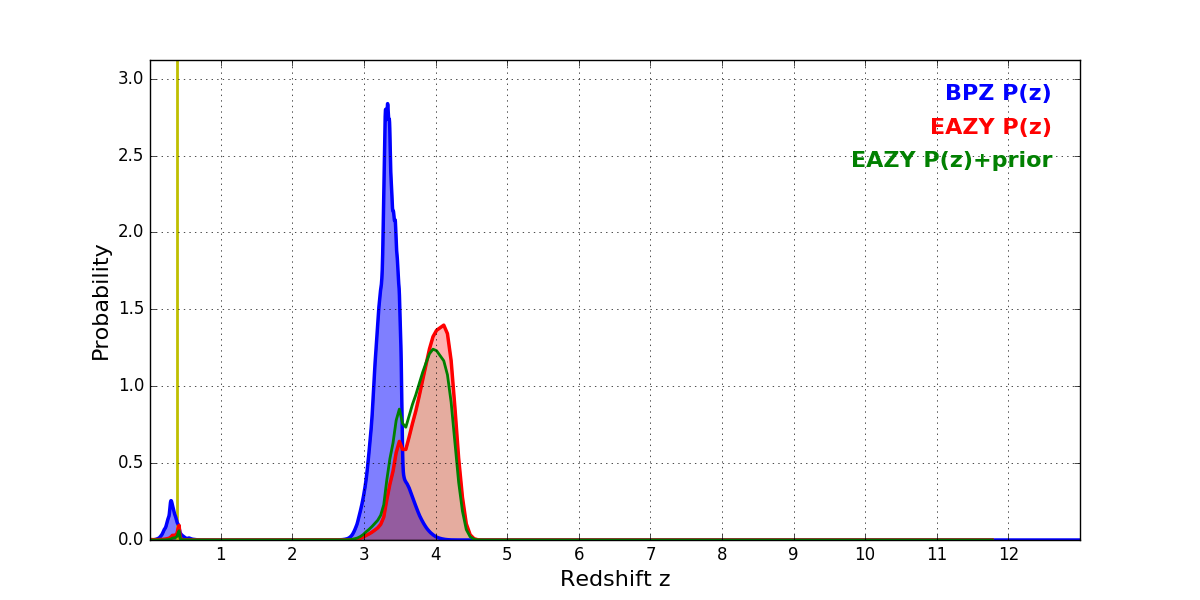 In P(z) plots: Yellow lines mark the cluster redshift z = 0.383,