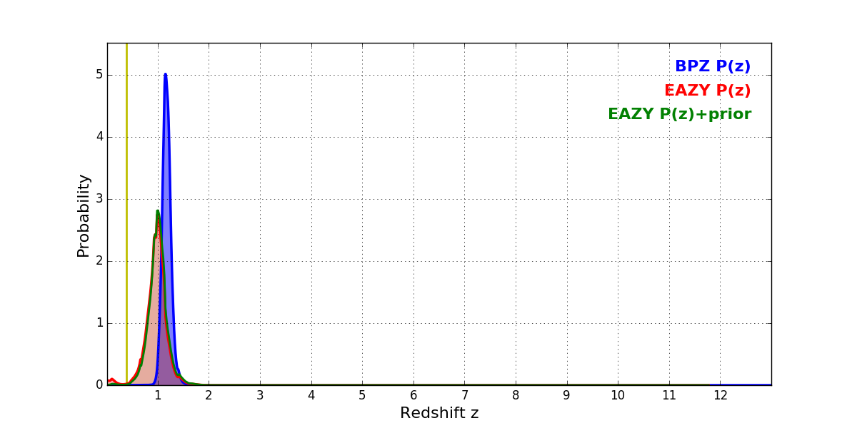 In P(z) plots: Yellow lines mark the cluster redshift z = 0.383,