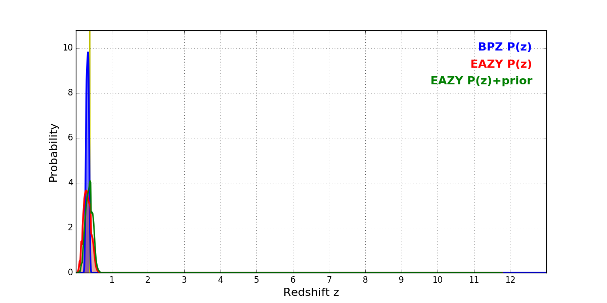 In P(z) plots: Yellow lines mark the cluster redshift z = 0.383,