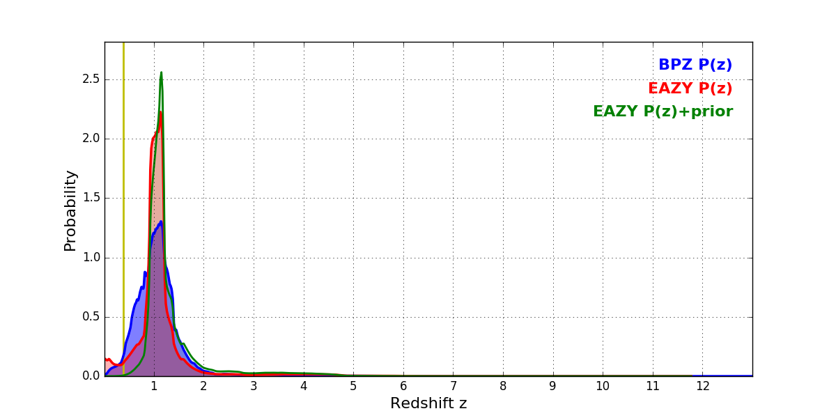 In P(z) plots: Yellow lines mark the cluster redshift z = 0.383,
