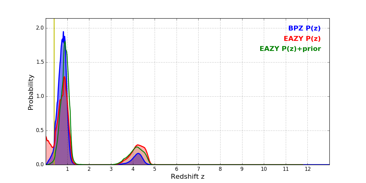 In P(z) plots: Yellow lines mark the cluster redshift z = 0.383,