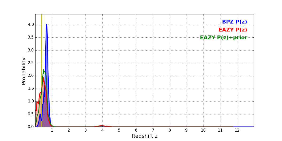 In P(z) plots: Yellow lines mark the cluster redshift z = 0.383,
