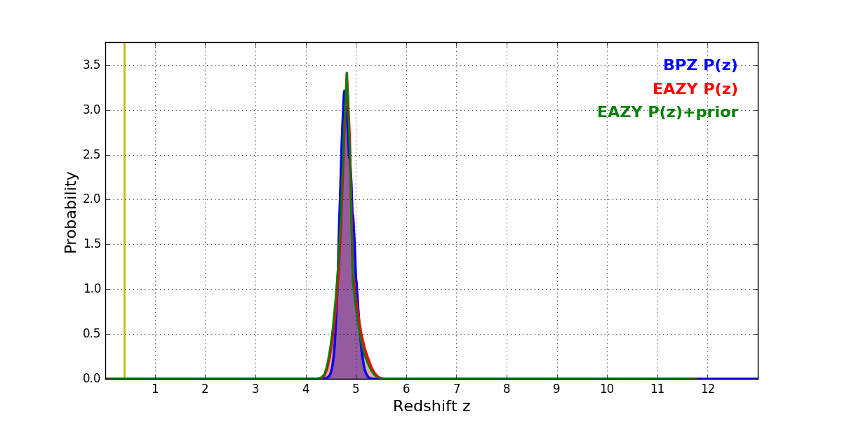 In P(z) plots: Yellow lines mark the cluster redshift z = 0.383,