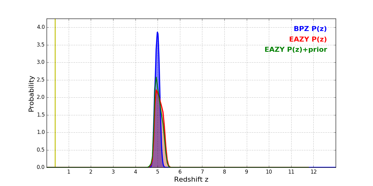 In P(z) plots: Yellow lines mark the cluster redshift z = 0.383,