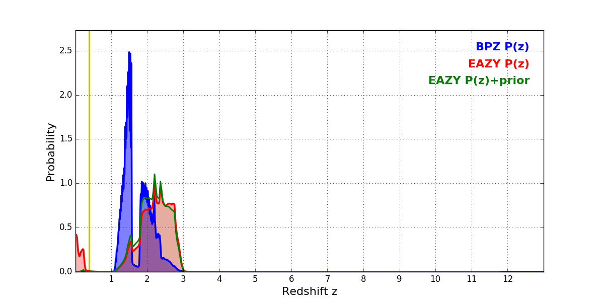 In P(z) plots: Yellow lines mark the cluster redshift z = 0.383,