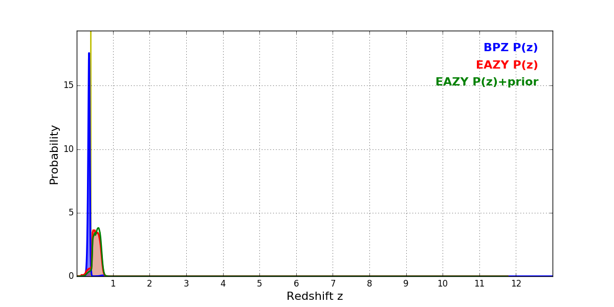 In P(z) plots: Yellow lines mark the cluster redshift z = 0.383,