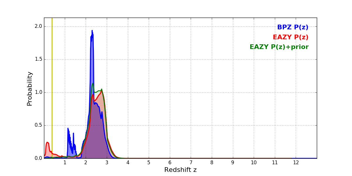 In P(z) plots: Yellow lines mark the cluster redshift z = 0.383,