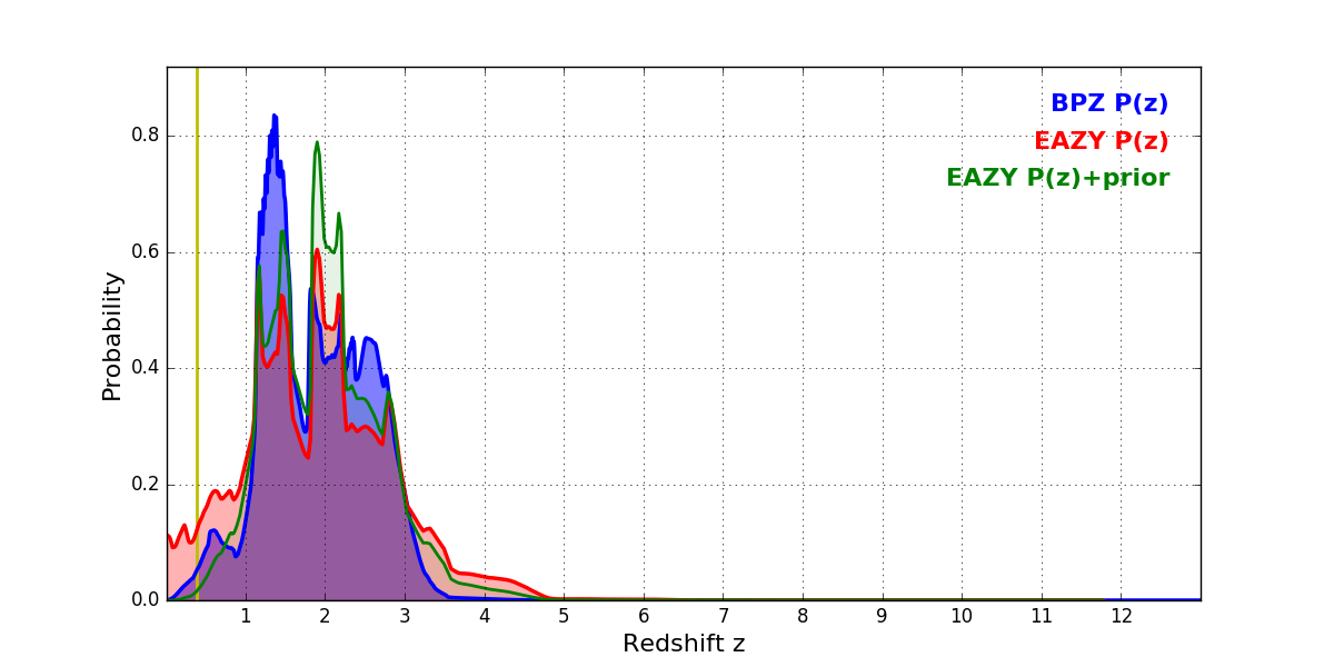 In P(z) plots: Yellow lines mark the cluster redshift z = 0.383,