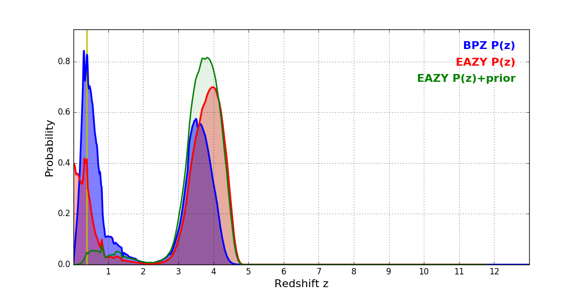 In P(z) plots: Yellow lines mark the cluster redshift z = 0.383,
