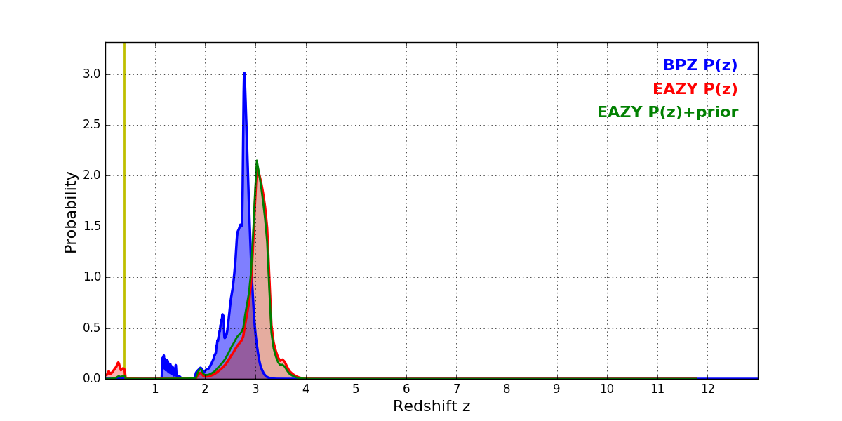 In P(z) plots: Yellow lines mark the cluster redshift z = 0.383,