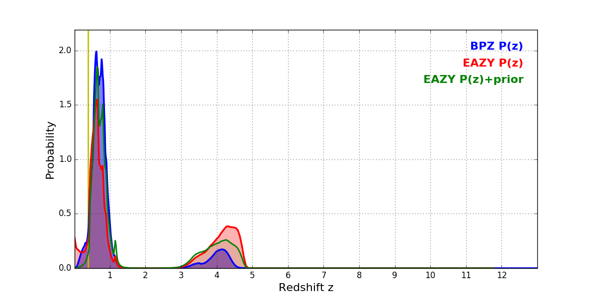 In P(z) plots: Yellow lines mark the cluster redshift z = 0.383,