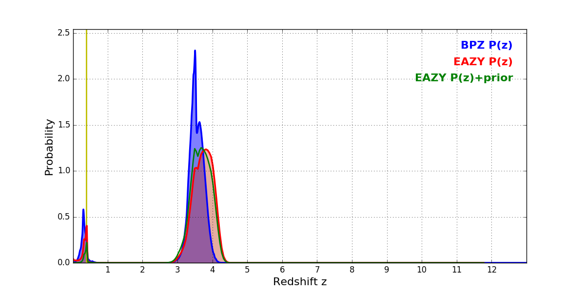 In P(z) plots: Yellow lines mark the cluster redshift z = 0.383,