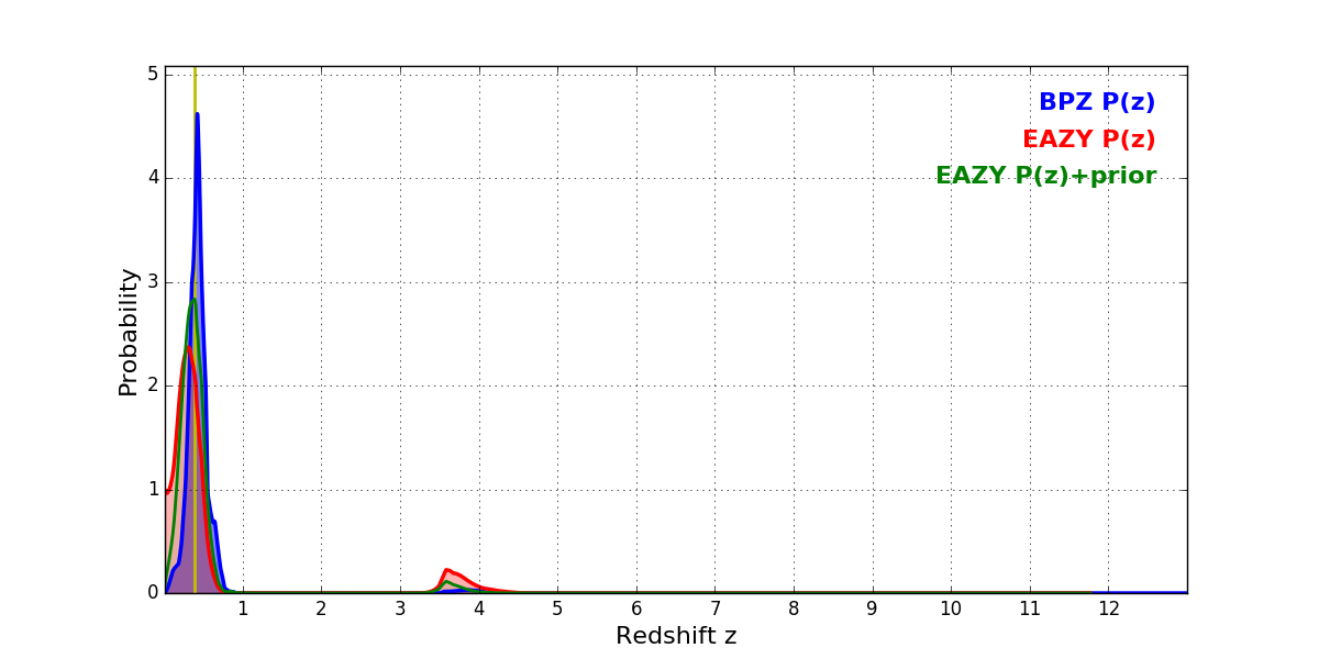 In P(z) plots: Yellow lines mark the cluster redshift z = 0.383,