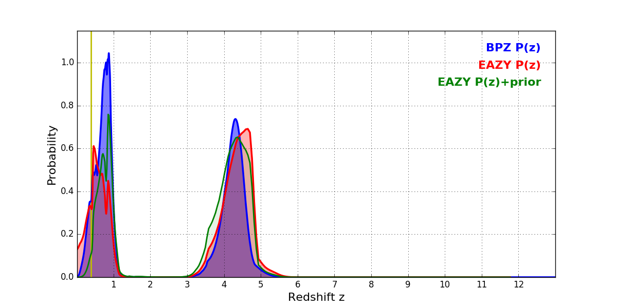 In P(z) plots: Yellow lines mark the cluster redshift z = 0.383,