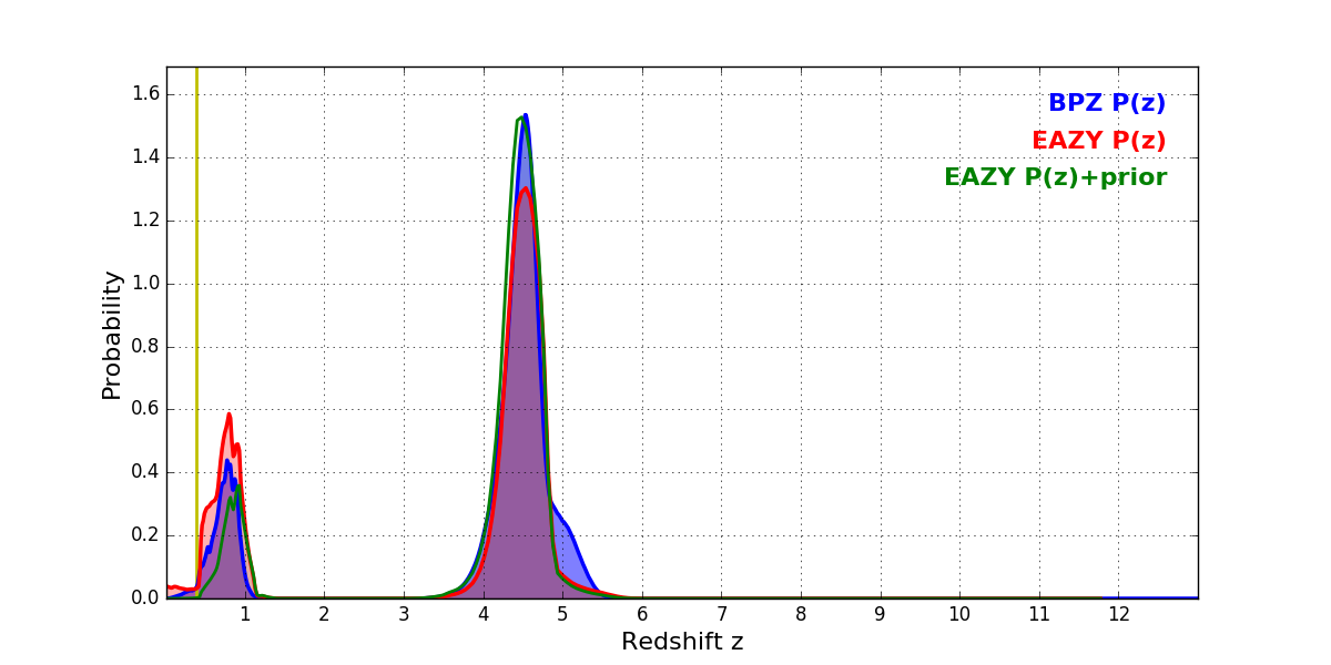In P(z) plots: Yellow lines mark the cluster redshift z = 0.383,