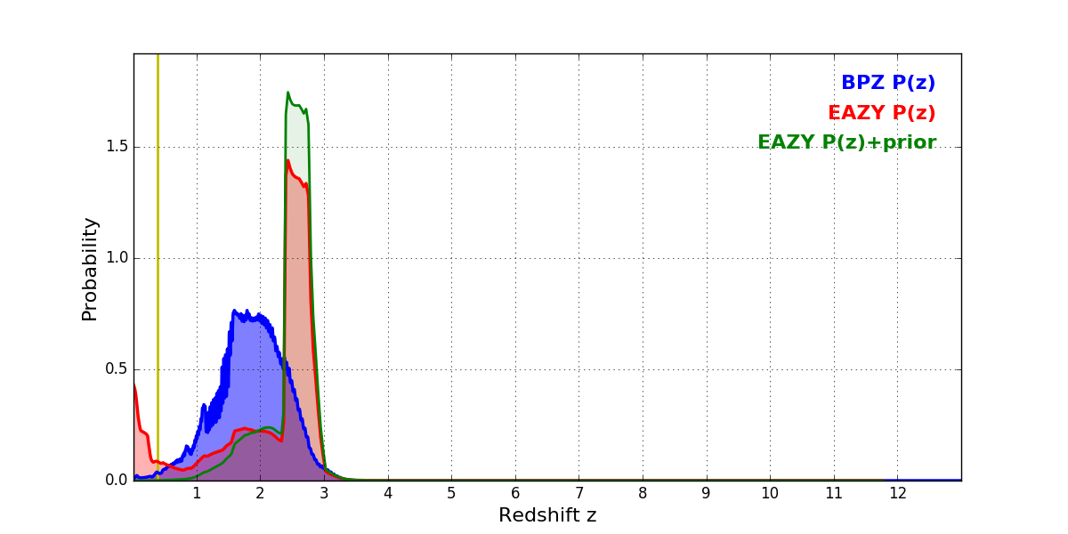 In P(z) plots: Yellow lines mark the cluster redshift z = 0.383,