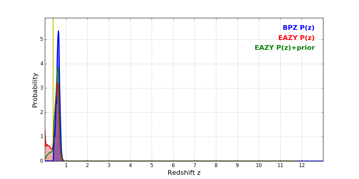 In P(z) plots: Yellow lines mark the cluster redshift z = 0.383,