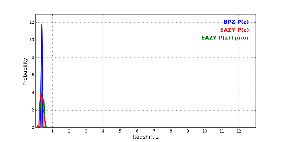 In P(z) plots: Yellow lines mark the cluster redshift z = 0.383,