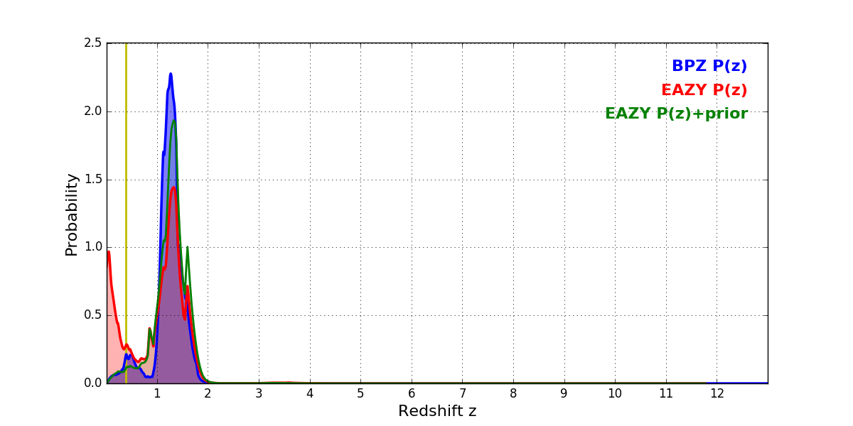 In P(z) plots: Yellow lines mark the cluster redshift z = 0.383,