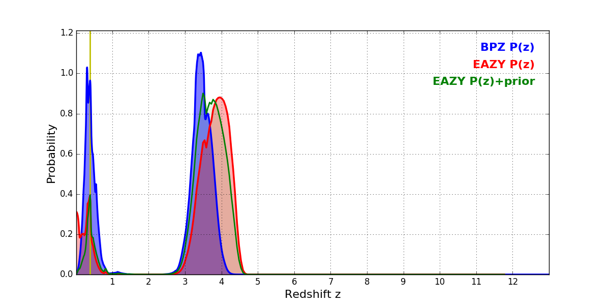 In P(z) plots: Yellow lines mark the cluster redshift z = 0.383,