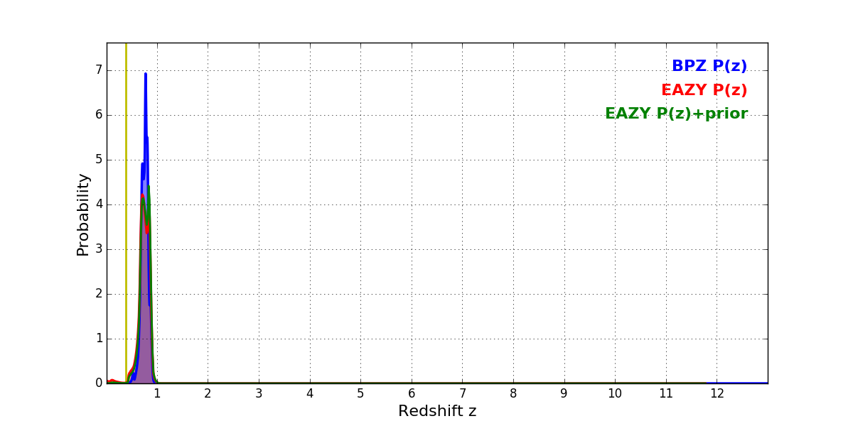 In P(z) plots: Yellow lines mark the cluster redshift z = 0.383,