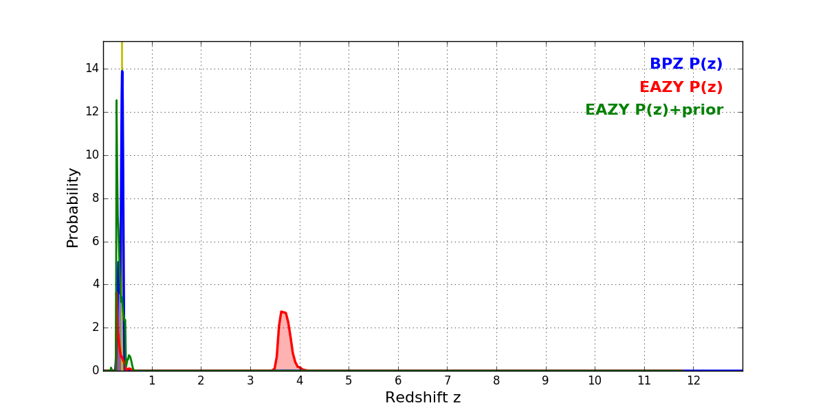 In P(z) plots: Yellow lines mark the cluster redshift z = 0.383,