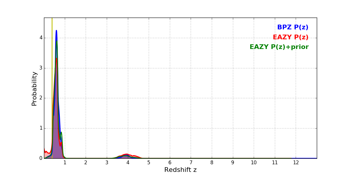 In P(z) plots: Yellow lines mark the cluster redshift z = 0.383,