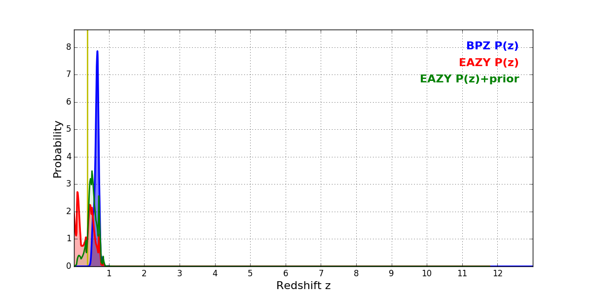In P(z) plots: Yellow lines mark the cluster redshift z = 0.383,