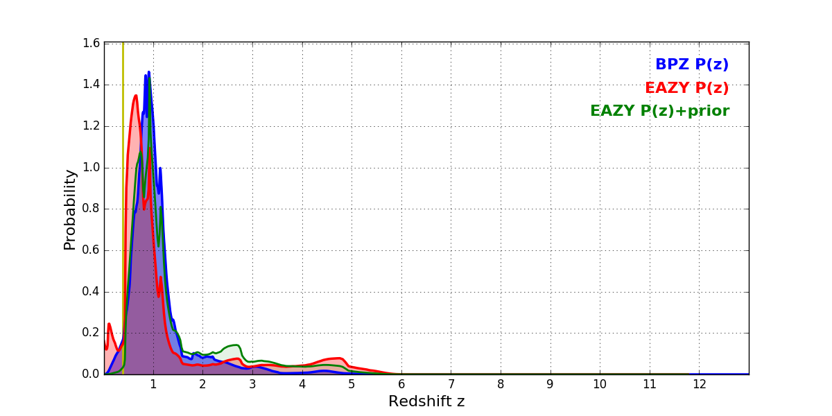 In P(z) plots: Yellow lines mark the cluster redshift z = 0.383,