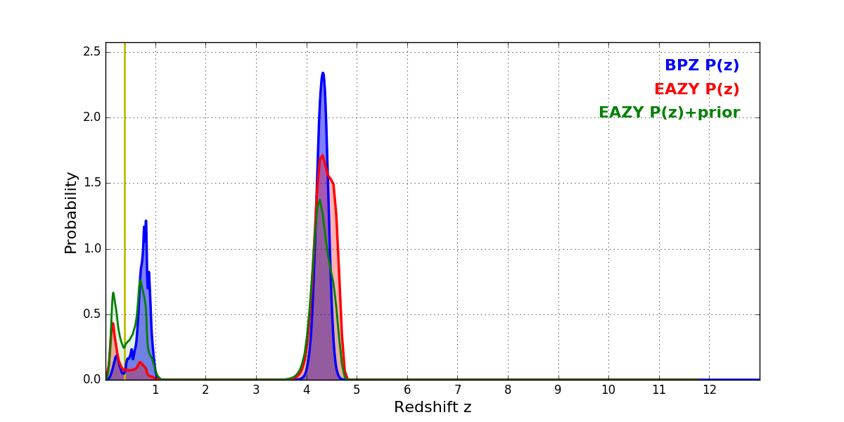 In P(z) plots: Yellow lines mark the cluster redshift z = 0.383,