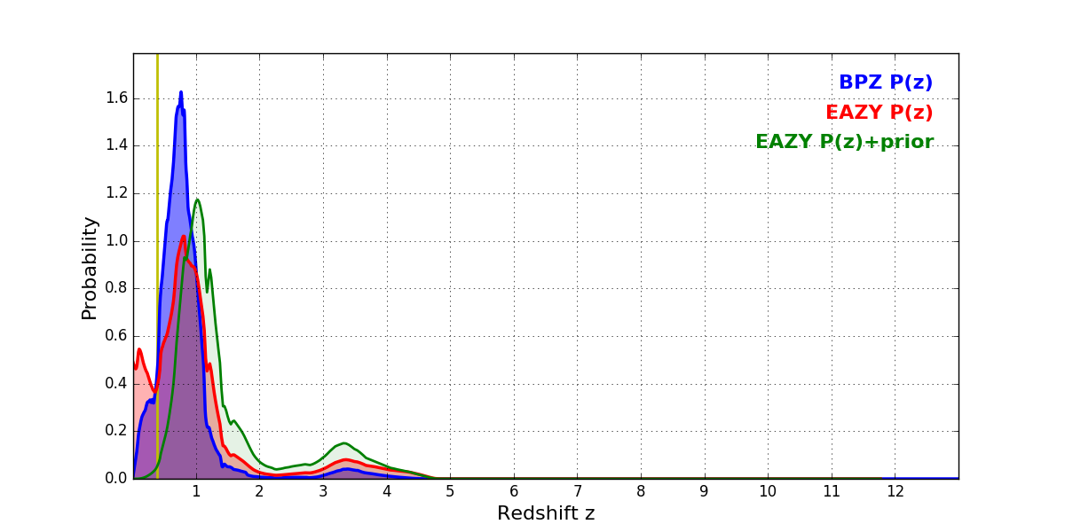 In P(z) plots: Yellow lines mark the cluster redshift z = 0.383,