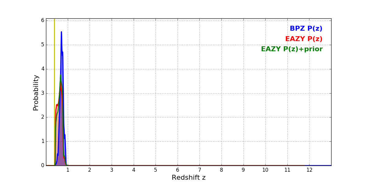 In P(z) plots: Yellow lines mark the cluster redshift z = 0.383,