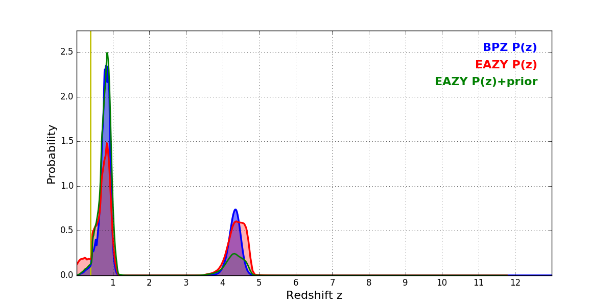 In P(z) plots: Yellow lines mark the cluster redshift z = 0.383,
