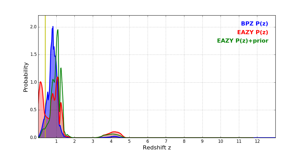 In P(z) plots: Yellow lines mark the cluster redshift z = 0.383,