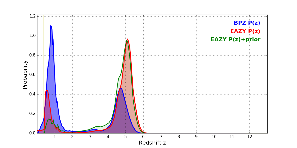 In P(z) plots: Yellow lines mark the cluster redshift z = 0.383,