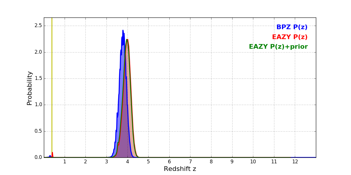 In P(z) plots: Yellow lines mark the cluster redshift z = 0.383,