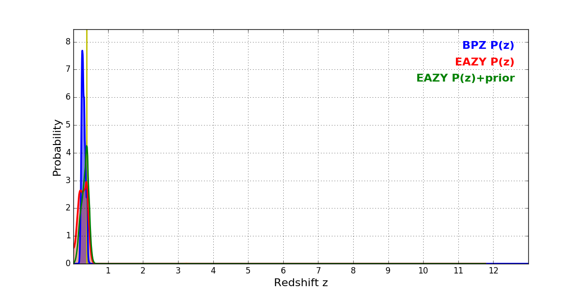 In P(z) plots: Yellow lines mark the cluster redshift z = 0.383,