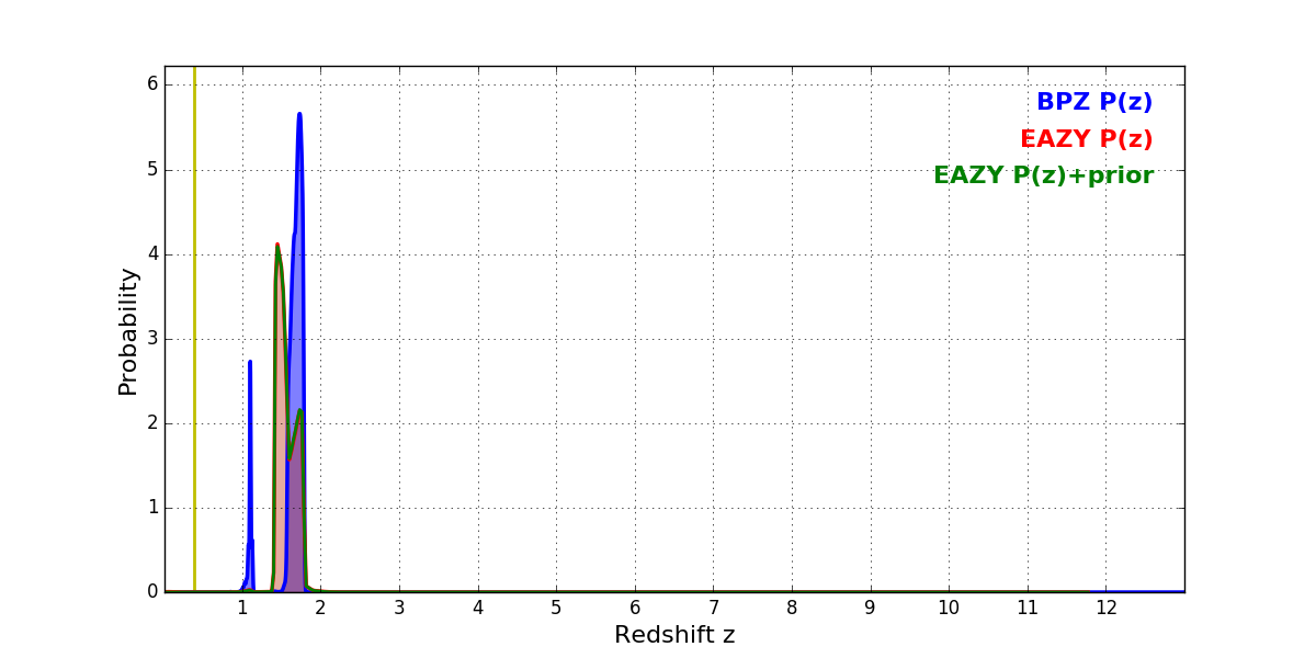 In P(z) plots: Yellow lines mark the cluster redshift z = 0.383,