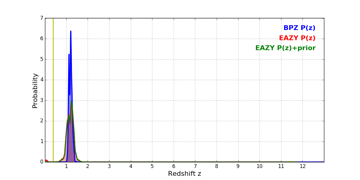 In P(z) plots: Yellow lines mark the cluster redshift z = 0.383,